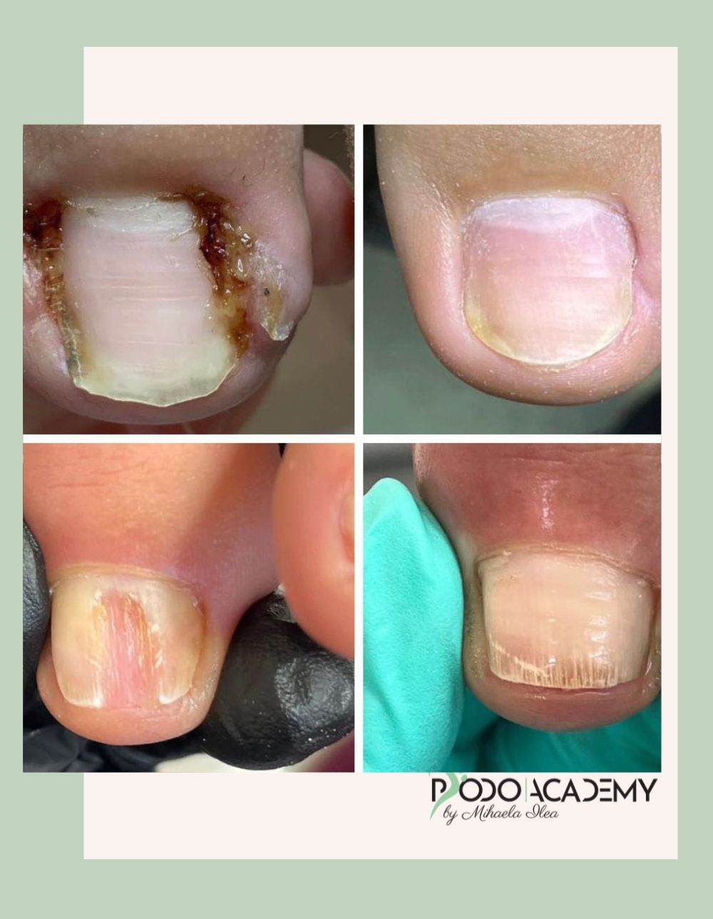 Ziua 3 – 09:00 – 13:00 Teorie 14:00 – 18:00 Practica igienizarea unghiilor problematice cu freza electrica, taierea corecta a unghiei incarnate si aplicarea buretelui Ligasano in pliuri, tehnica de indepartarea a keratozei de pe tălpi cu ajutorului spatulei, igienizarea ragadelor si finisarea tegumentului cu ajutorul capisoanelor de smirghel/diamantate, ocluzia ragadelor, indepartarea clavusurilor cu freza electrica si protectia zonei cu protectoare, indepartarea onicofozelor din jurul placii unghiale, stilizarea cuticulei cu clestele, exfolierea celulelor moarte si hidratarea tegumentului. protocolul de protectie si preventie contra microorganismelor, maja terapeutic.